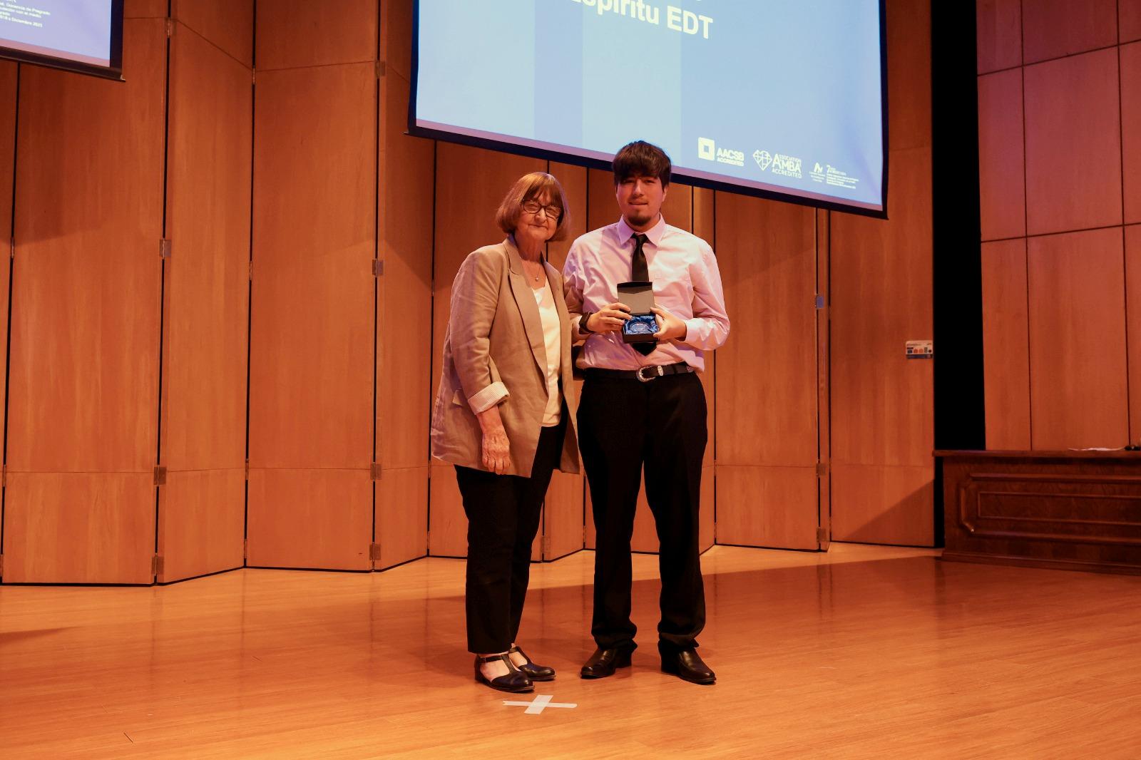 Axel Zúñiga junto a la Rectora Rosa Devés, tras recibir el premio “Espíritu EDT”.